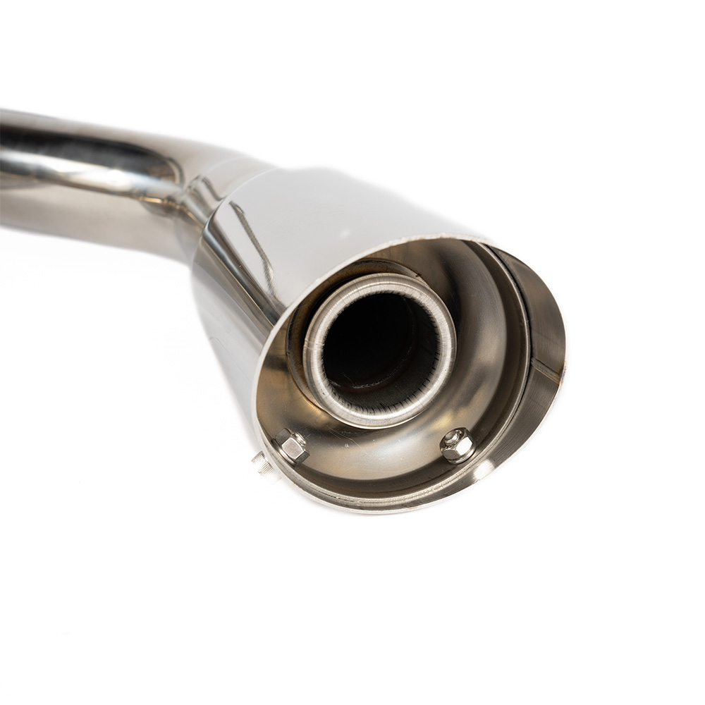 Gepolijste t304 RVS einddemper van M2 Motorsport met enkele 75mm (3 inch) uitgang.